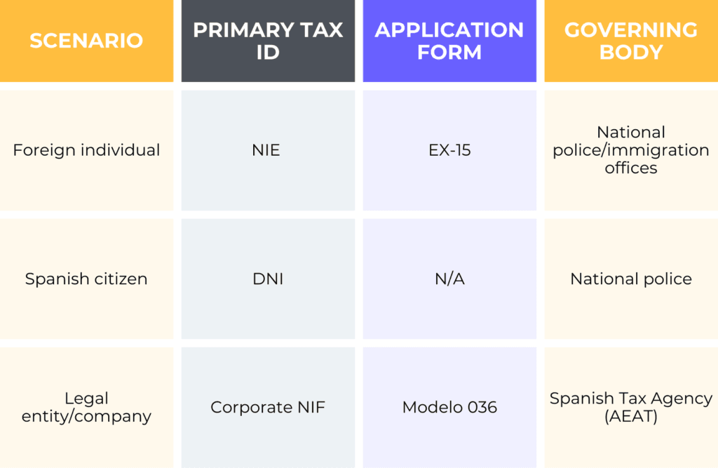 - DNI (Documento Nacional de Identidad): For Spanish citizens, the national ID number automatically serves as their tax number, known as the NIF (Numero de Identificacion Fiscal).