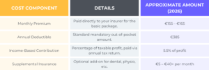 - Monthly premium: This is the fee you pay directly to your chosen insurer. For the basic package in 2026, this typically ranges from €155 to €165 per month. You can lower this premium by opting for a higher annual deductible.