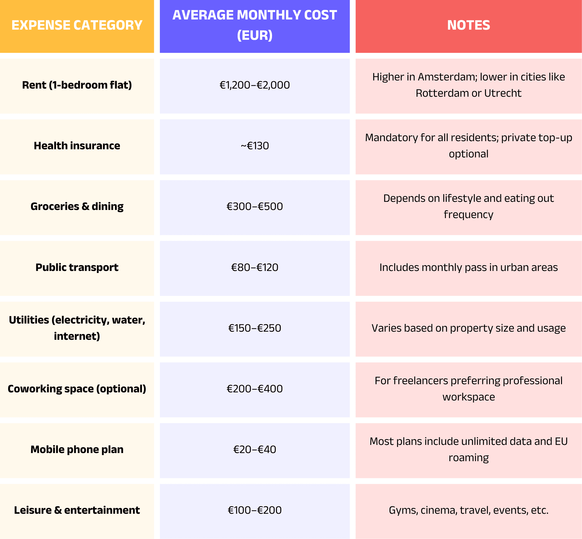 Understanding the tax system and living expenses is essential for financial planning if you're planning to freelance in the Netherlands.