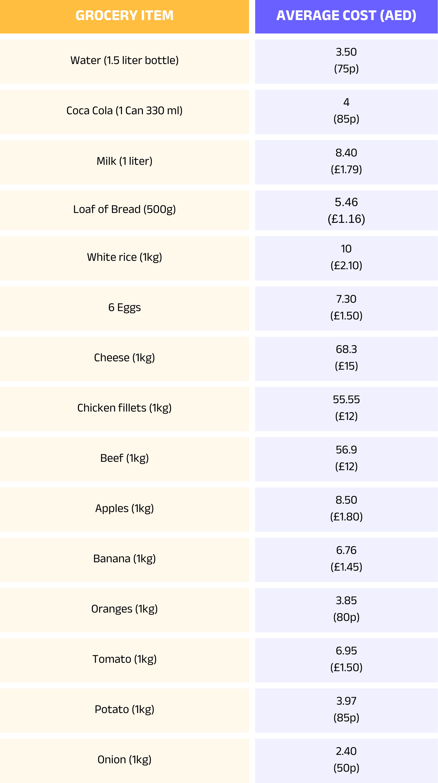 Supermarkets and hypermarkets are readily available throughout the city and, according to Property Finder, these are the average prices for everyday grocery items: