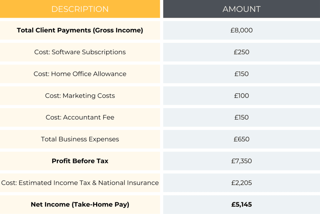 Your gross income is the starting point. Your net income is where you finish after all calculations. Consider this simple example for a UK-based freelancer: