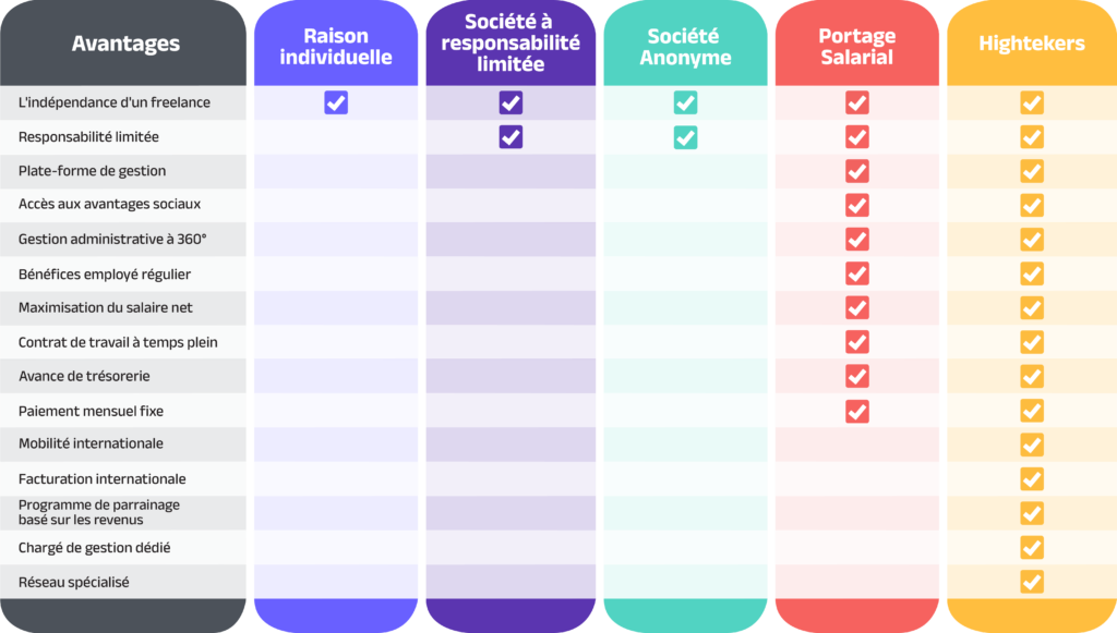 - Avec Hightekers, vous n’avez plus besoin de vous soucier de votre statut de freelance car vous devenez un employé à temps plein avec un contrat à temps avec Hightekers.