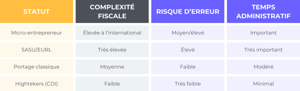C’est pour cela que de nombreux consultants seniors choisissent aujourd’hui des modèles hybrides et innovants comme Hightekers, qui centralisent la contractualisation internationale, la facturation, la conformité fiscale et les déclarations sociales. Cette solution vous permet d’éviter des erreurs coûteuses et de garder une excellente visibilité sur leur net réel.