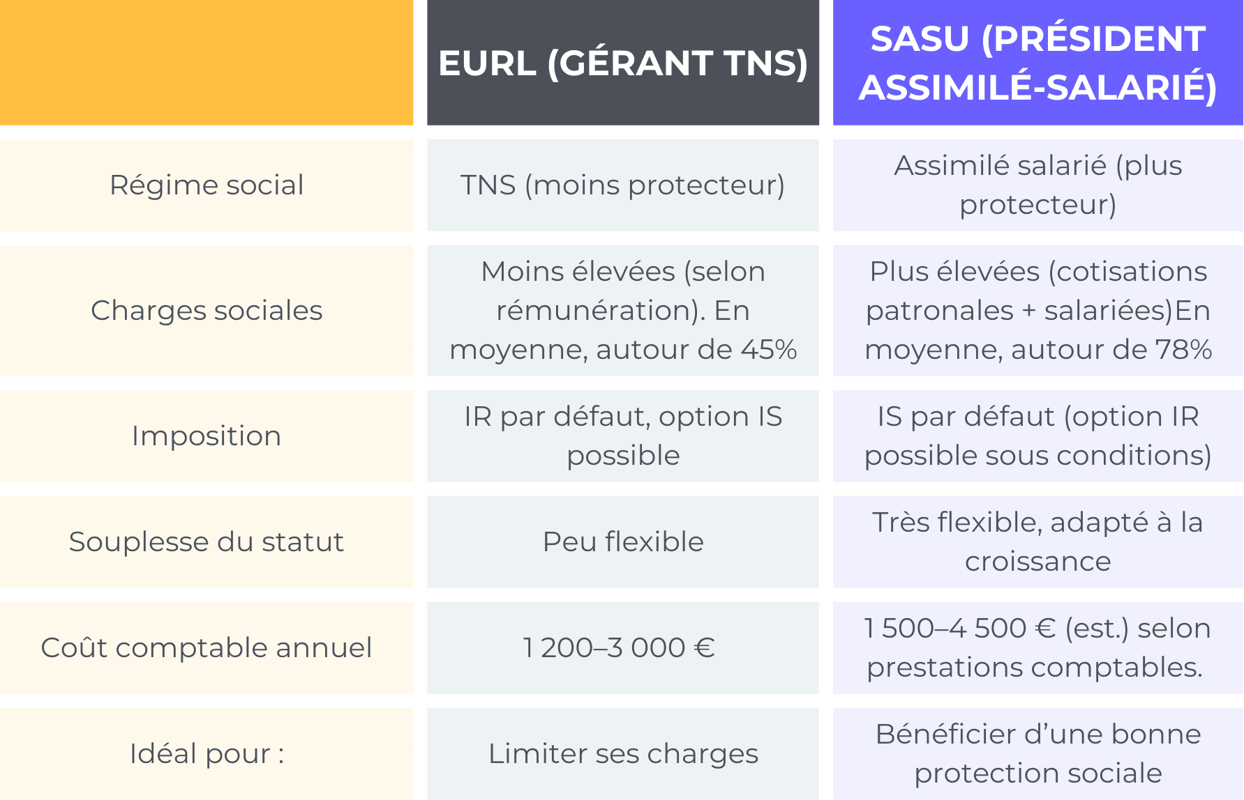 - EURL = optimisation des charges possible mais protection sociale moindre et gestion administrative lourde