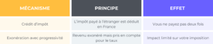 La France a signé plus de 120 conventions fiscales bilatérales (USA, UK, Allemagne, Suisse, Émirats, etc.) afin d’éviter que vous soyez taxé deux fois sur le même revenu.